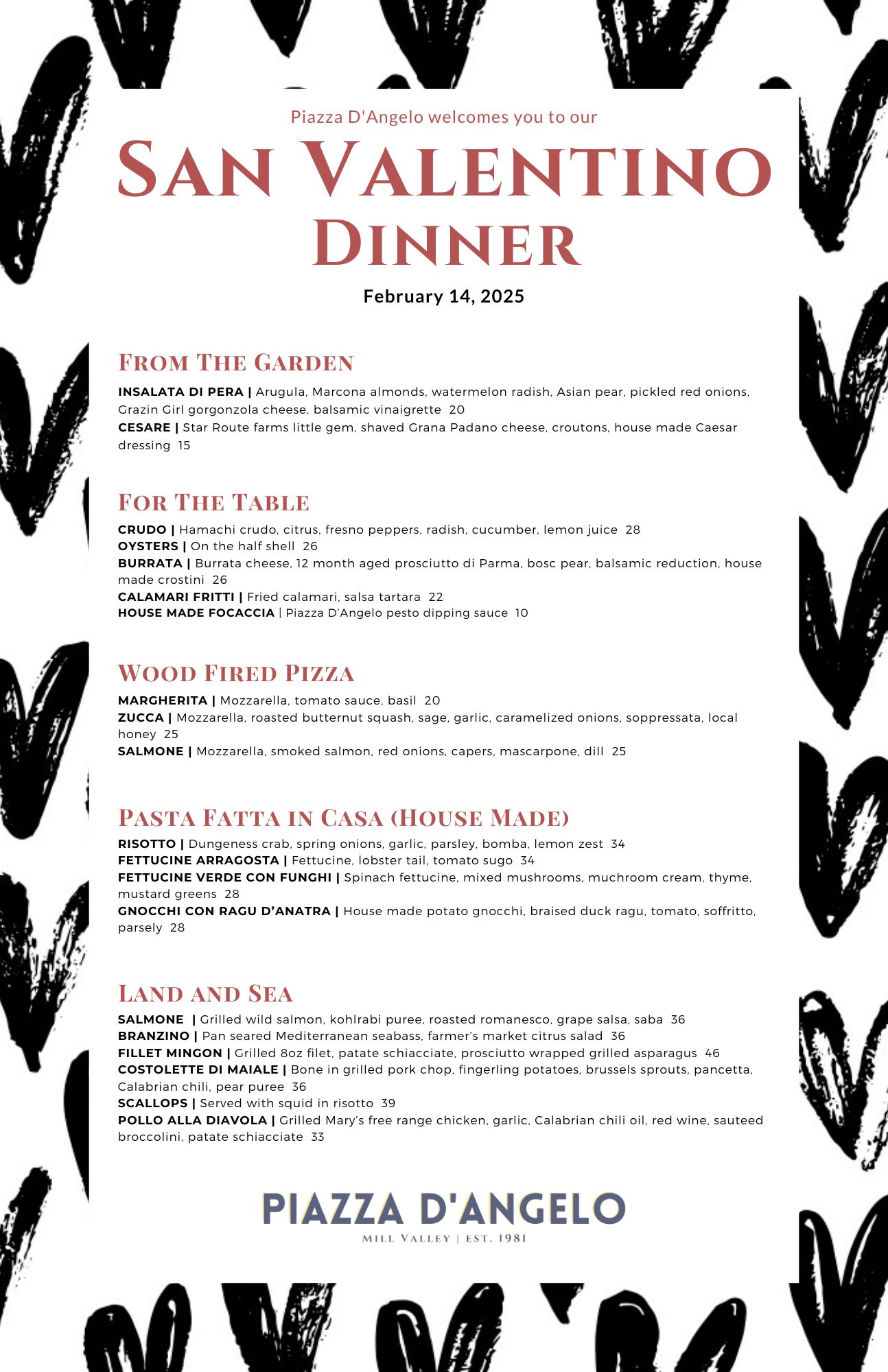 Named after our location right on the piazza of downtown Mill Valley, Piazza D'Angelo is an ode to Southern trattorias - family owned, rustic neighborhood restaurants that serve fresh, unassuming, locally-sourced delicious food. Enjoy a variety of fresh pastas, wood-fired pizzas, antipasti, as well as fresh fish, prime meats and our signature tiramisu.
